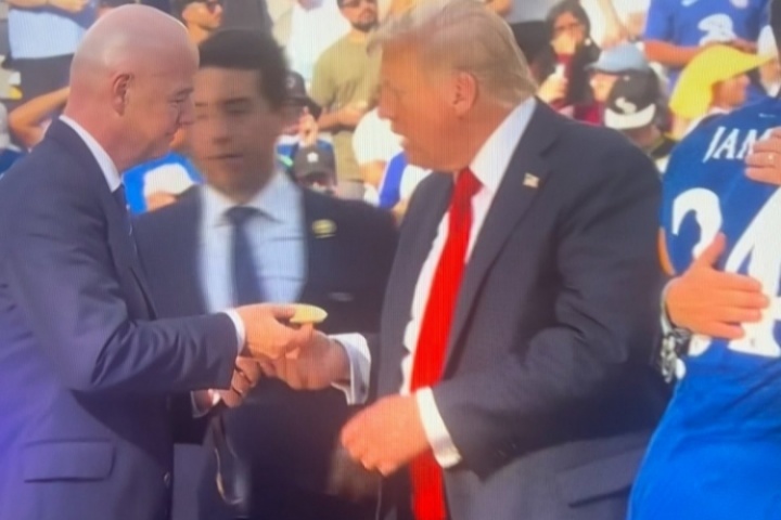 体育资讯07月16日讯 世俱杯决赛,切尔西3-0战胜巴黎夺冠,赛后美国总统特朗普参加颁奖典礼。在颁奖典礼上,特朗普从国际足联主席因凡蒂诺手中接过一块冠军奖牌,随后放进了自己的口袋里。
